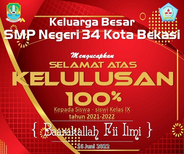 Selamat dan sukses kepada peserta didik SMPN 34 Kota Bekasi Kelas IX Tahun ajaran 2023-2023 telah dinyatakan Lulus 100 %. Bagi yang membutuhkan Surat Keterangan Lulus (SKL) bisa di unduh melalui link berikut :Administrator | 10 Juni 2024 | Dibaca : 945